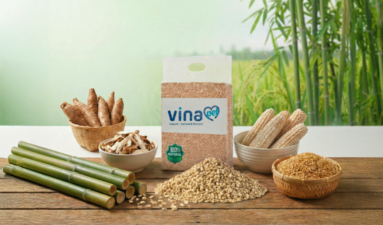 Cát bã sắn cao cấp Vinapet với độ thấm hút siêu tốt, vón nhanh, khử mùi tốt, ít bụi, thân thiện môi trường. Sản xuất từ bã sắn tự nhiên, phân hủy sinh học, nhận OEM/ODM toàn cầu.