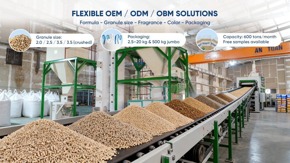 Tối ưu giá thành & logistics: Cát tre từ phụ phẩm nông nghiệp – giá tốt, kết hợp với quy mô sản xuất lớn của Vinapet cho ra chi phí ODM cạnh tranh nhất.