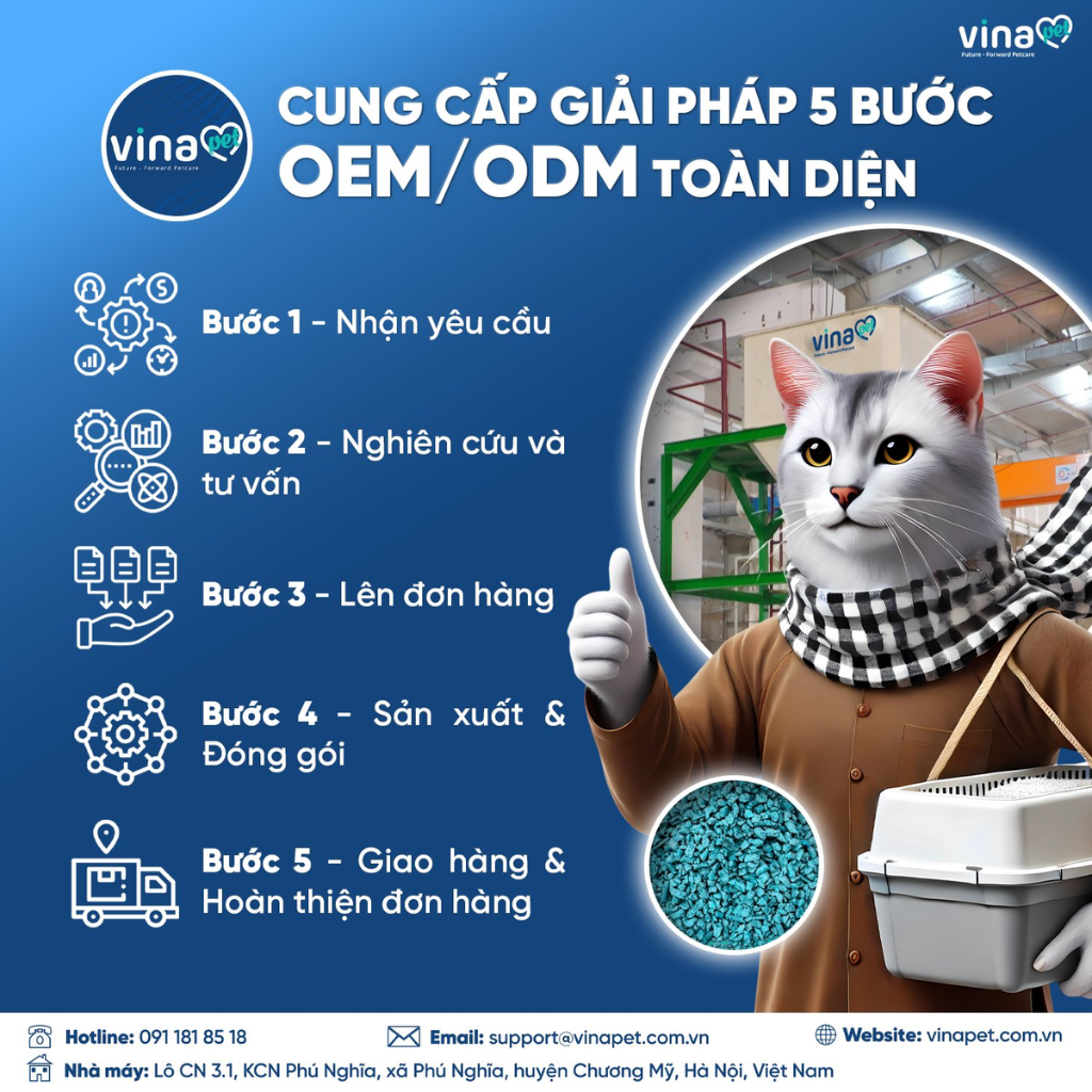 - Đối tác OEM/ODM: Thành quả từ R&D độc quyền là nền tảng vững chắc giúp chúng tôi tự tin cung cấp dịch vụ gia công cát mèo OEM/ODM với các công thức độc quyền cho đối tác, giúp họ duy trì uy tín thương hiệu trên thị trường.